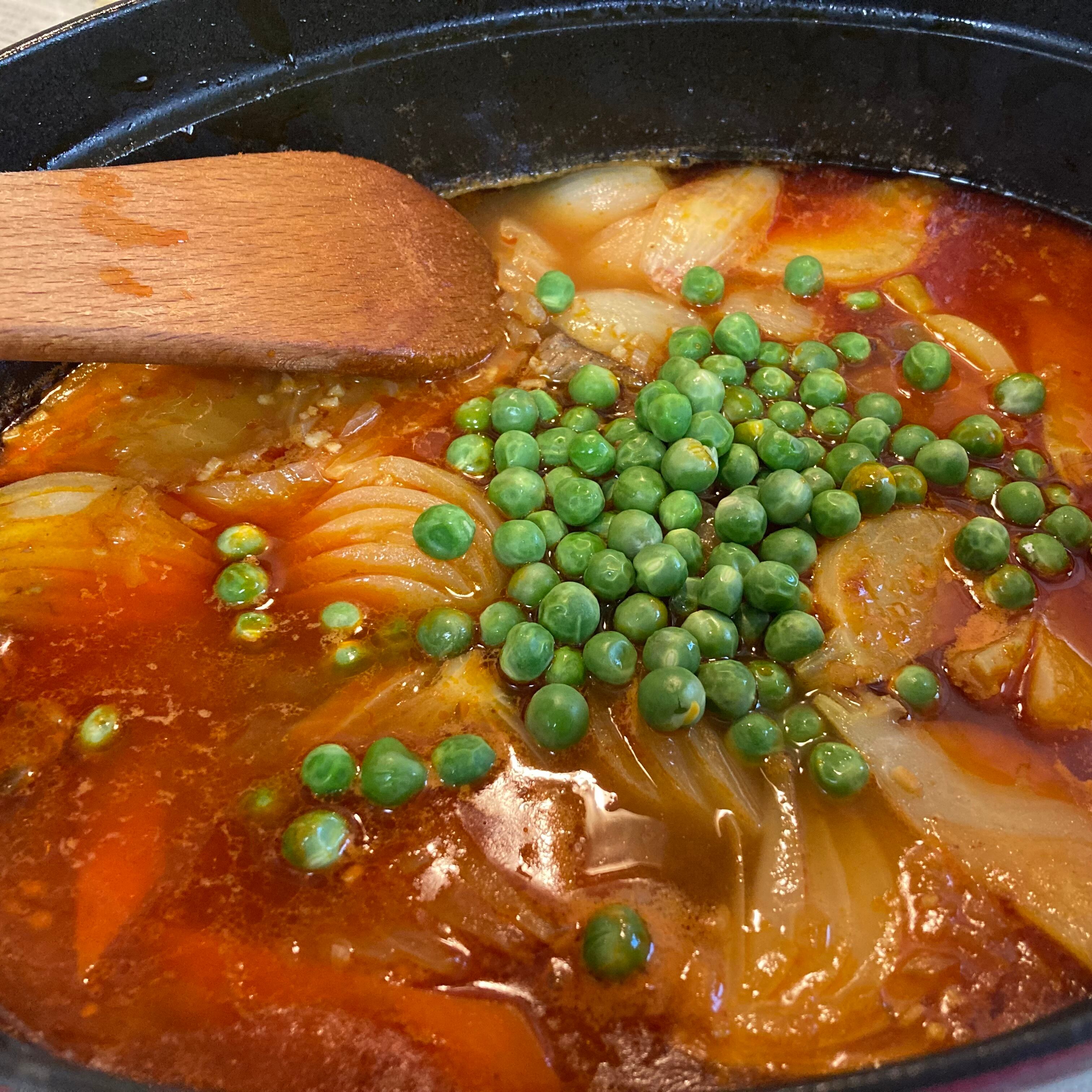 ニンニク、トマト、玉ねぎ、マッシュルーム、グリンピース(こちらはブロッコリーなど他の野菜に変える場合もございます)、ニンジン、カブと様々な野菜を使用した、ヘルシーながらもボリューム感のあるメインです。
