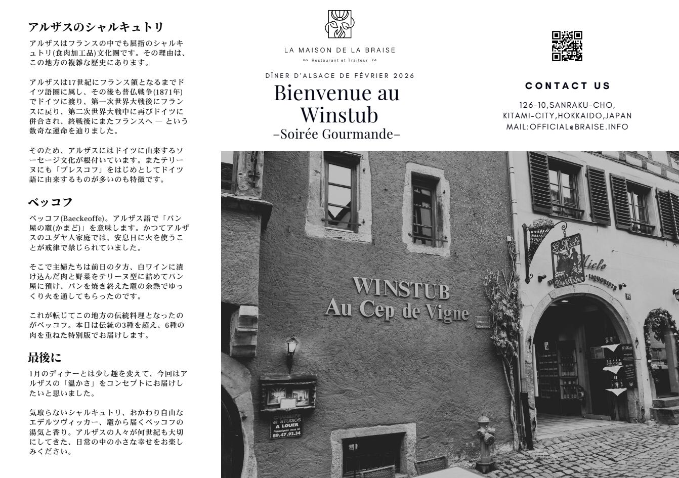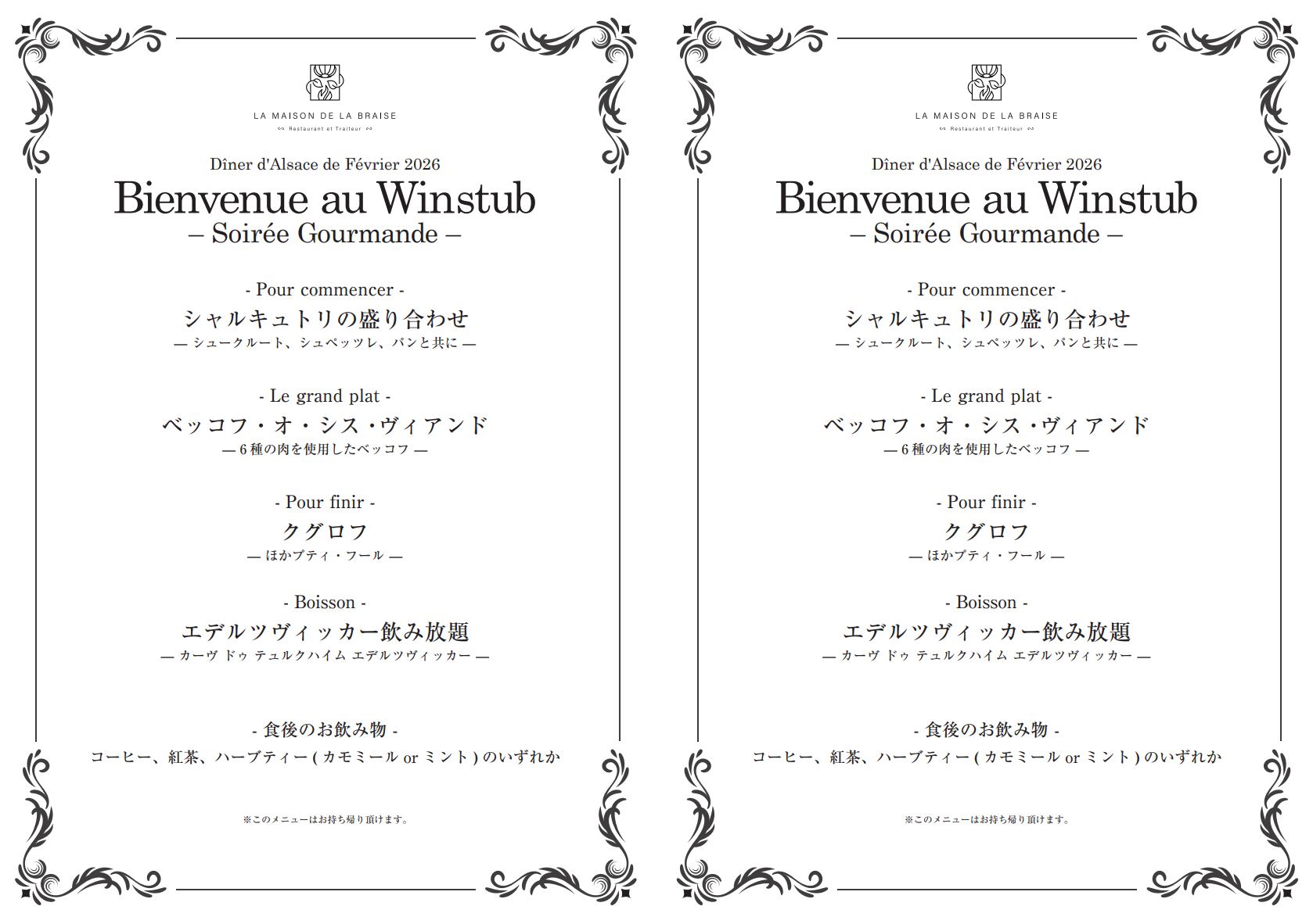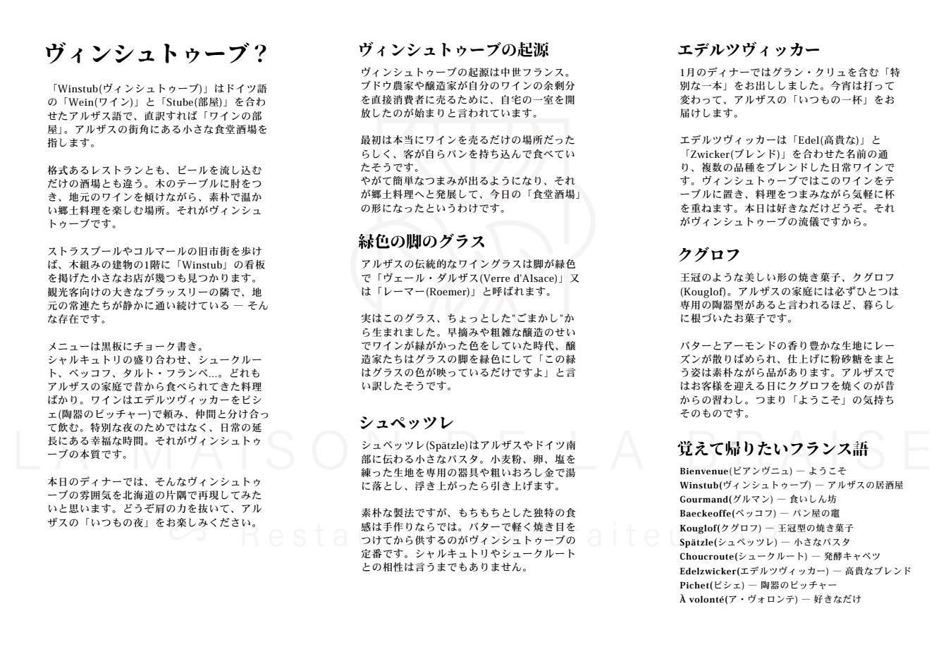 【茶室:4名様まで】 2月28日限定ディナー「Bienvenue au Winstub - Soirée Gourmande - ~ヴィンシュトゥーブへようこそ!アルザスの雰囲気を楽しむ賑やかな夜~ 」