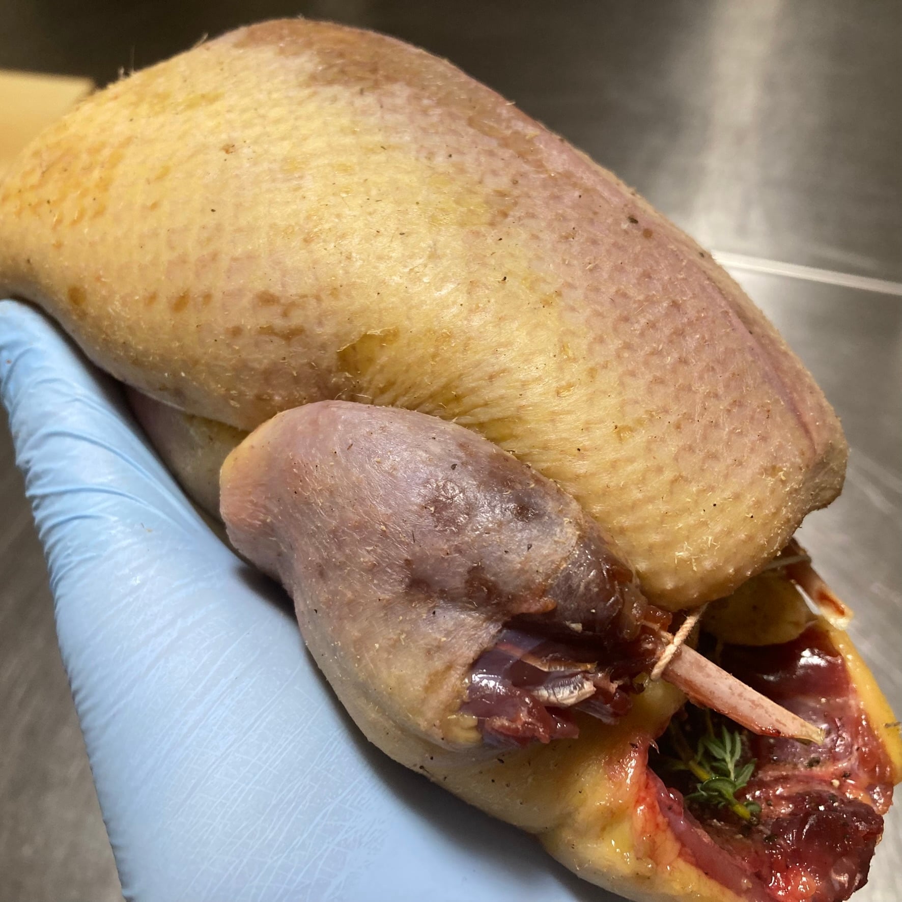 腕利きの猟師さんが仕留めた新潟産の天然マガモを丸ごとロティ。